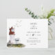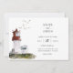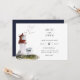 Akvarell fyr, sjöfartstema bröllopsinbjudan. Koordinerande mörk marinblå färg på baksidan. Inbjudan har chic typografidesignstil med en blandning av kalligrafi och fet stil.