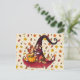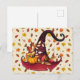 Charmig säsongsbetonad vykort med en akvarell mörkröd häxhatt med pumpa och höstfärgning, på en bakgrund av höstlöv
