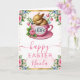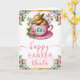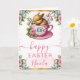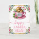 Dela varma vårönskningar med detta bedårande påskkort med en söt sovande kanin inklämd i en rosa tekopp prydd med ömtåliga blommor. Omgivande rosor, tulpaner, fjärilar och mjuk akvarellgrönska bildar en ljus och upprymd ram som fångar årstidens glädje. Den pastellfärgade paletten och de eleganta påskmotiven gör denna design perfekt för att skicka hjärtliga hälsningar till vänner och familj. Anpassningsbar text låter dig lägga till ett namn eller ett meddelande för en unik påskskatt.