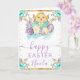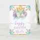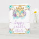 Skicka varma vårhälsningar med det här glada påskkortet som visar en söt gul kyckling som kommer ut ur ett dekorerat blått ägg bundet med ett band. Mjuka pastella florala motiv i lila, turkos och vitt omger konstverket, medan gulddekorationer ger en festlig säsongsskimmer. Den uppiggande akvarellpaletten och de charmiga påskmotiven gör denna design perfekt för att dela högtidsglädje med vänner och familj. Personlig text låter dig lägga till ett namn eller ett meddelande för en hjärtlig, enastående hälsning.