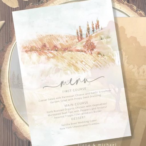 Fredfull landskapsvy med böljande kullar och majestätiska träd används i denna brölloppsbrevpapperssamling för att skapa en varm och intim ton för ditt bröllop. En handskriven, signerande stil kombinerad med en modern sans serif lägger till en elegant touch. 'Tack'-kortet som visas här har böljande kullar och träd i nyanser från gyllene gult till rostrött med en bakgrund av drömlika akvarellfärgfläckar. Framsidan av kortet har elegant kalligrafi 'Tack' och en liten hjärtprydnad på en gradientgyllene bakgrund. Lägg till ditt personliga tackmeddelande och namn med hjälp av den medföljande mallen. Sök ID786 för att se andra delar och färgval för denna uppsättning.