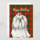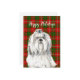 Julkort med akvarellillustration av Lhasa Apso på festlig grön och röd rutig bakgrund och anpassningsbart julsäljande.