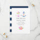 Trendiga marinblå och vita nautiska bröllopsinbjudningar med en akvarellblomma ankare och marinblå rand på baksidan.