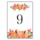 Bord 9. Festlig bordskort med akvarellillustrationer av pumpor och lönnblad. Detta pumpor bordskort är perfekt för Thanksgiving och höstbröllop, examen, baby shower, bröllops shower och andra evenemang.
