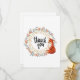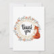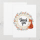 Akvarellillustration av sittande räv och delikat krans med persikofärgade blommor och grå blad. Mitten "tack" text.