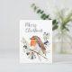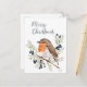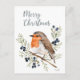 Den här charmiga julkortet med lägenhetsmotiv har en söt akvarellillustration av en rödhake som sitter på en gren med vinterbär och löv. Fågelns ikoniska röda bröst är vackert markerat mot de dämpade gröna och mörkblå nyanserna på bären, vilket ger designen en mysig, rustik och naturlig känsla. Den eleganta skrivstilens text lyder "God Jul", vilket gör detta kort till ett underbart val för att skicka varma, traditionella hälsningar med en vacker naturinspirerad touch.