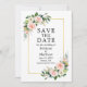 Elegant Akvarell Rosa Rosor och Vita Blommor Spara Datum Bröllopsinbjudan Kort innehåller botanisk grönska på en guldram. Foto baksida.