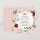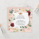 Original handmålad akvarell höstfärgad blommig design med karmosinröda krysantemum, korallrosor och olika blad och löv element. Bakgrundsfärgen på framsidan är en mjuk varm rosé korallfärg men kan ändras för att matcha din bröllopsfärg. Baksidan har en tunn grå rutiga ränder. Copyright, Audrey Jeanne Roberts.
