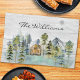 Vi presenterar vår Akvarell Rustik Dim Skog Stuga Berg kökshandduk . med en akvarellstuga inbäddad i en dimmig grön tallskog. Perfekt för uthyrning av semesterstuga, lodge, sjöhus och stuga.
