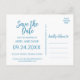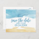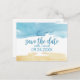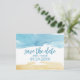 Detta akvarell-sand-och-havs-spara-datum-postkort är perfekt för en strandbröllop. Den abstrakta designen har en gul och blå akvarellstruktur som är arrangerad för att framkalla havs- och oceanstämning.