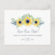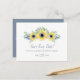 Meddela din förlovning med min botaniska akvarell solros, eukalyptus grönska och blå save the date vykort med "save our date" i chic kalligrafi. Den blomsterkortet vänder till en enfärgad kompletterande blå färg med era namn och bröllopsdatum med utrymme för gäst adressering. Perfekt bröllopsmeddelande för sensommar och höst trädgård bröllop. För att se den matchande bröllopps pappersvaror besök VG Invites på Zazzle