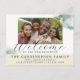 Ett roligt, glatt och fräscht akvarelldesign med akvablåa och krämiga färger för ett anpassat Välkommen till Grannskapet familjefoto och informationskort! Perfekt att ge med några färska blommor eller kakor!