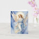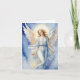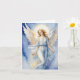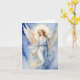 Akvarellängel med gult vågigt hår. Hennes armar är utsträckta vid sidorna, hennes ögon är slutna och hennes huvud är böjt nedåt till höger som om i bön. "God Jul" skrivet i ljusblått på insidan till vänster.
