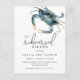Den perfekta bröllopsrepetitionens middagsinbjudan för middagar längs kusten, denna design har en blå krabba i det övre hörnet i levande akvareller tryckt på ett vykort. Den medföljande inbjudantexten är modern med en avslappnad elegans som är både smakfull och gästvänlig. Anpassa textmallen med dina specifika detaljer. Denna inbjudan är ett underbart val för repetitionsmiddagar i kustnära områden eller middagar där skaldjur serveras.