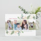 Den här fina julkortet har en vacker ram med akvarellbotaniska motiv och hälsningen "GLAD". Hälsningen på framsidan är helt anpassningsbar så att du kan ändra den till vad du vill. Designen är enkel men elegant. På framsidan av kortet finns det plats för tre foton (två vertikala och en horisontell). På baksidan hittar du ett vackert koordinerande mönster med akvarellbladverk. Du kan anpassa baksidan ytterligare genom att ta bort mönstret och lägga till ett annat foto och/eller text genom att välja "anpassa denna design ytterligare" längst ned i rullgardinsmenyn "personalisera".