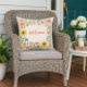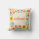 Välkommen gäster till din veranda eller uteplats med denna livfulla blomsterkudde. Denna tvåsidiga design kan anpassas med ditt namn eller annan text. Blommönstret är hämtat från en akvarellillustration. Kuddarna visas i en skyddande tyg lämplig för utomhusbruk, med alternativ på inomhuspolyester eller bomullstyg också tillgängliga.