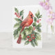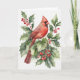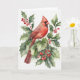 Akvarellkardinal och järnek med bär. Insidan av kortet säger "God Jul" på vänstersidan med rött.