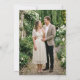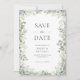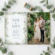 Meddela din kommande bröllop med detta eleganta grönsakliga save the date-kort. Det har en klassisk kant av akvarell-eukalyptusblad och ömtåliga vita blomsterkvistar på en krispig vit bakgrund. Anpassa med ditt foto på baksidan. Denna design är perfekt för par som planerar en romantisk vår- eller sommarträdgårdsceremoni med botaniskt tema.