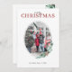 Det här är ett glatt julkort med modern typsnittsstil, akvrellgrönska och ovala foton på båda sidor. Kortet innehåller totalt 4 fotografier. Fotografierna är av prostooleh / Freepik.