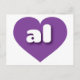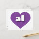 Det här vykortet har ett dynamiskt hjärta för lila som innehåller det feta, vita, rundade, nedre fodral brev al, en lekfull förkortning för Alabama, gulvita. Kortets baksida är tom och väntar på din anpassade text eller handskrivna stämningar. Roll tide!