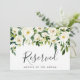 Ange reserverade platser på ditt bröllop med denna chic, juveltonade blommiga skylt. Anpassa med två rader anpassad text i kalligrafi och modern blockbokstav (visas med "Reserverat" och namnet på gästen med reserverad plats), infattad av vita akvarellblommor och grönt lövverk.