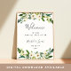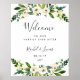 Välkomna gäster till bröllop med vår Alabaster-Blommigt som poster, med lush-vattenfärg botaniskt grönt och vita blommor, med "välkommen till vår lyckliga dag efter" ditt namn och bröllop dejtar i en chic blandning av moderna block- och handskrivna kalligraftypsnitt.