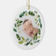 Den runda fotodekorationen har ditt lilla foto som är inramat av en andedräkt av gröntens vattenfärg botaniska blad och vita blommor. Anpassa baksidan med anpassningsbarnas rubrik (visas med "[namn] första jul" och året.
