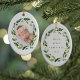 Söta fotodekorationer har din lilla foto som är inramad av en ovalig krans av grönt vattenfärg botaniskt blad och vita blommor. Anpassa baksidan med anpassningsbarnas rubrik (visas med "[namn] första jul" och året.