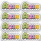 Namn Alan i färglös bubbelgummiskrift. Färg kan ändras.