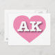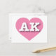 Detta vykort har ett coolt rosa hjärta som innehåller de feta vita versalerna AK, den officiella förkortningen för Alaska, den sista fronten. Baksidan av vykortet är tomt och väntar på dina handskrivna känslor eller anpassad text.