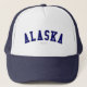Kontrollera ut denna Alaska hatt! Är du från Alaska? Har du en vän eller en familjemedlem som älskar Alaska? Om så, är denna "baner" hatt exakt gåvan som du söker efter! Designen presenterar "Alaska" i välvd marinbokstäver i klassikerhögskolastilsorten.