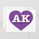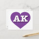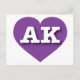 Detta vykort har ett dynamiskt hjärta för lila som innehåller den feta, vita, övre fodral brev AK, förkortningen officiell för Alaska, den sista gränsen. Baksidan av vykortet är tom och väntar på dina handskrivna känslor eller anpassade texter.