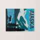 Underbart poster stil-konstverk har Alaska-berg med glaciärer, vatten, träd och en älg. Roligt för hela familjen.