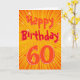 60:e födelsedagskortet. Ålder 60 Roligtars 3D Radial Sunburst Gult, Orange, rött 60: e födelsedagskortet. Orange, Gult och röd 3D-effekt är linjer mönster-formgivning med Grattis på födelsedagen-text, nummer 60 text och stjärnor. Inuti texten står det: "Wishing you a Väldigt Lycklig 60 Birthday." Om du vill kan du anpassa texten inuti texten.
