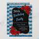 Elegant blå, silver glitter och röd ros födelsedagsfest inbjudan för kvinnor oavsett ålder. Åldern kan ändras för vilken ålder som helst. Text kan ändras till vad som helst för att passa din händelse. Typsnitt, typsnitt färg och text är helt anpassade! Papper form och typ kan anpassas efter din budget och smak!