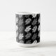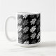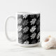 Silhuett av äldre trädblad i ett ytligt mönster med grå och vit detalj på svart bakgrund.