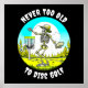 Blått och grönt vintage med ett skelett i en golfplatta i skogen med citatet "Aldrig för gammalt för att skiva golf".