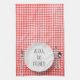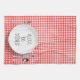 Alexa elektroniskt enhetskommando för att tvätta diskar på vit midplatta på röd och vit gingham mönster.