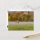 Anpassningsbart vykort med ett älgpar som betar på ett fält en kylig höstmorgon med viss kvarvarande dimma. Den stora tjurälgen äter gräs medan den kvinnliga koälgen tittar på. Detta är i Boxley Valley, Arkansas, USA.