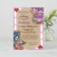 Denna fantasifulla inbjudan har ett färgglatt Alice i Underlandet-sagomotiv med teapartyt tema. En bild av den leende katten visas i det övre högra hörnet. Den galne hattmakarens hatt och en trave tekoppar är placerade i det nedre vänstra hörnet. Bakgrunden har ett ljusrött harlekinmönster med en rosa ram. Två röda hjärtan är placerade i motsatta hörn för att likna ett spelkort.