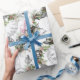 En älskvärda Alice i underlandcollage, med Alice, den Cheshire katten, vitkanin, den tokiga hatteren, vintageteakoppen, tekanna och rova, är fastställd på en bakgrund av vintage bild av järneken som är ordnade i diagonal linjer på vit, gör en enkelt elegant och nätt jul och ett litterärt themed slående in papper.