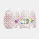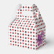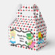 Cute Alice i Wonderland temaparty favör box för ett barns födelsedag. Den lilla flickan Alice i sin blå klänning och Mad Hatter sitter ovanpå ett kortdäck mönster i rött och svart med spader och diamantsymboler. Coola cheshire cat and caterpelare på båda sidor.