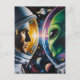 Alien och astronaut i rymden... gör en stare ner. Bakgrund av stjärnor och planeter.