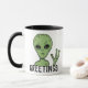 Hand plockade digitala konstutlänningar som viftar med tre finger, UFO-kaffe mugg.
