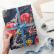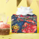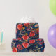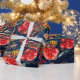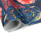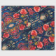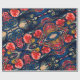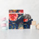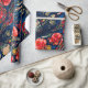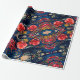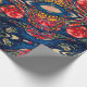 En sofistikerad papper inslagning med röda poppor i orangen och blåa snurrar plus lite geometriskt inslag. Designad av Alexandra Cook alias Linandara för en ljus framtid för lycklig.
