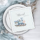 All aboard the baby train baby shower theme done in watercolors, soft blues. Sweet choo choo train complete this cute design. The simple soft colors sets the tone for a sweet themed baby shower. Such a sweet and simple napkin for that special event. Perfect for a baby boy shower. Coordinating pastel scalloped frame finish off this adorable napkin.