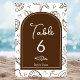 This All I Sea Is Love Brown Seashells Table Number features a warm earthy brown background decorated with whimsical doodles of seashells, starfish, hearts, sparkles, and other coastal touches. A solid brown arch with a thin white interior arch sits centered on the card, creating a refined space for your text. Inside the arch, “All I Sea Is Love” appears at the top, followed by editable names, a small seashell illustration, and the table number. Fully customizable, it’s perfect for rustic beach weddings, boho coastal themes, and earthy shoreline celebrations.