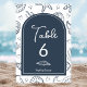 This All I Sea Is Love Dark Blue Seashells Table Number showcases a bold deep blue background filled with playful coastal doodles—seashells, starfish, hearts, sparkles, and waves. At the center, a solid dark blue arch with a thin white inner outline frames the editable text beautifully. Inside, the phrase “All I Sea Is Love” sits at the top, followed by a customizable line for names, a simple seashell illustration, and the table number. Dramatic, elegant, and entirely editable, it suits nautical weddings, evening ocean themes, and deep-sea–inspired celebrations.