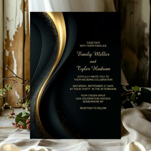 All in One Elegant Black and Gold Wedding Inbjudningar