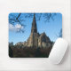 A high-resolution view of the Grade II listed All Saints Church in Salterhebble, West Yorkshire. The image captures the church’s impressive Gothic Revival spire and detailed stonework from the perspective of the historic graveyard. Framed by silhouetted tree branches against a crisp blue sky, the late afternoon sun illuminates the weathered textures of the sandstone, highlighting the architectural heritage of the Calderdale region.